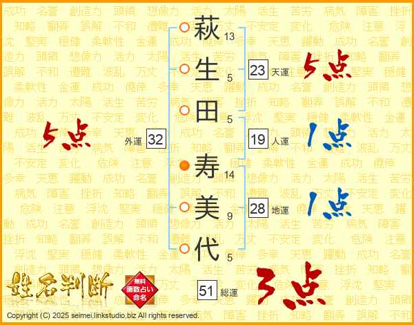 萩(13画)生(5画)田(5画) 寿(14画)美(9画)代(5画)