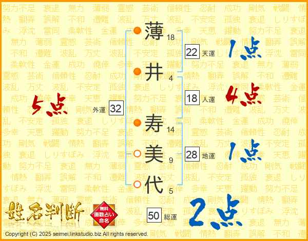 薄(18画)井(4画) 寿(14画)美(9画)代(5画)