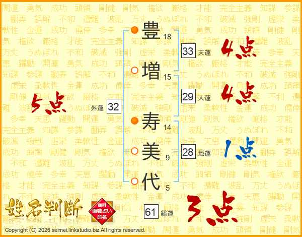 豊(18画)増(15画) 寿(14画)美(9画)代(5画)