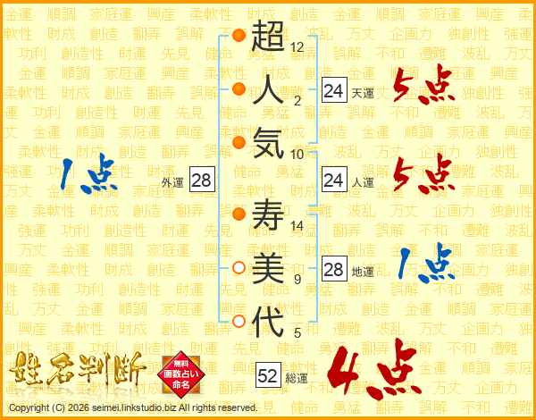 超(12画)人(2画)気(10画) 寿(14画)美(9画)代(5画)