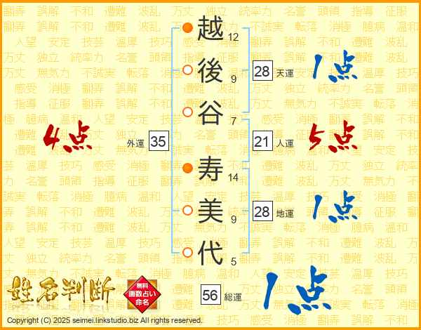 越(12画)後(9画)谷(7画) 寿(14画)美(9画)代(5画)