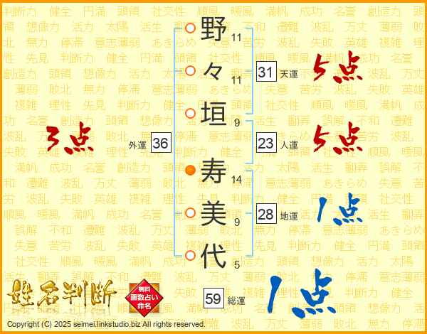 野々垣寿美代さんの人運は23画の5点!