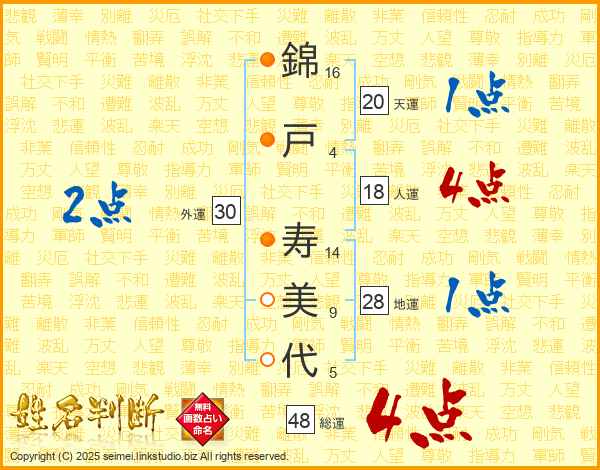 錦(16画)戸(4画) 寿(14画)美(9画)代(5画)
