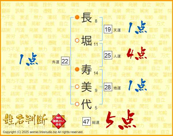 長(8画)堀(11画) 寿(14画)美(9画)代(5画)