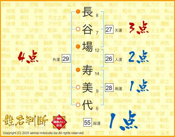長(8画)谷(7画)場(12画) 寿(14画)美(9画)代(5画)