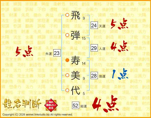飛(9画)弾(15画) 寿(14画)美(9画)代(5画)