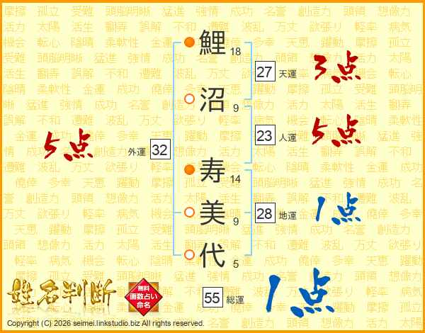 鯉(18画)沼(9画) 寿(14画)美(9画)代(5画)