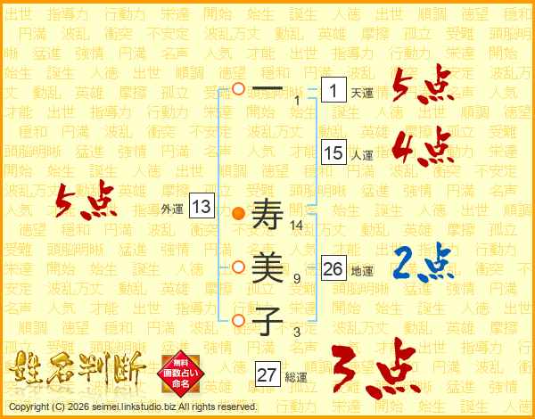 あなたの人生を表す1番重要な運勢です。生涯を通じて影響する総合運となり、主に50歳以降の晩年期に影響を及ぼします。苗字と名前の合計画数。
