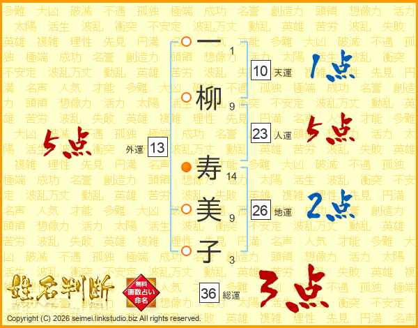 一(1画)柳(9画) 寿(14画)美(9画)子(3画)