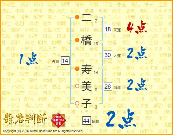 二(2画)橋(16画) 寿(14画)美(9画)子(3画)