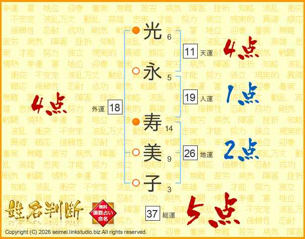 光(6画)永(5画) 寿(14画)美(9画)子(3画)