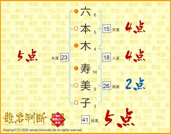 六(6画)本(5画)木(4画) 寿(14画)美(9画)子(3画)