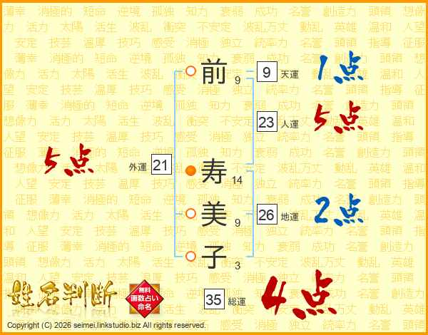 前(9画) 寿(14画)美(9画)子(3画)