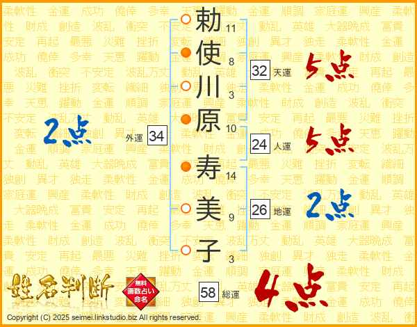 勅使川原寿美子さんの総運は58画の4点!