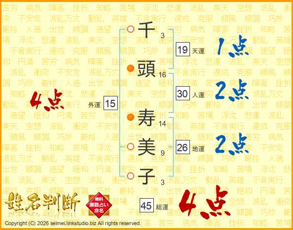 千(3画)頭(16画) 寿(14画)美(9画)子(3画)