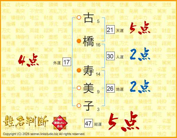 古(5画)橋(16画) 寿(14画)美(9画)子(3画)