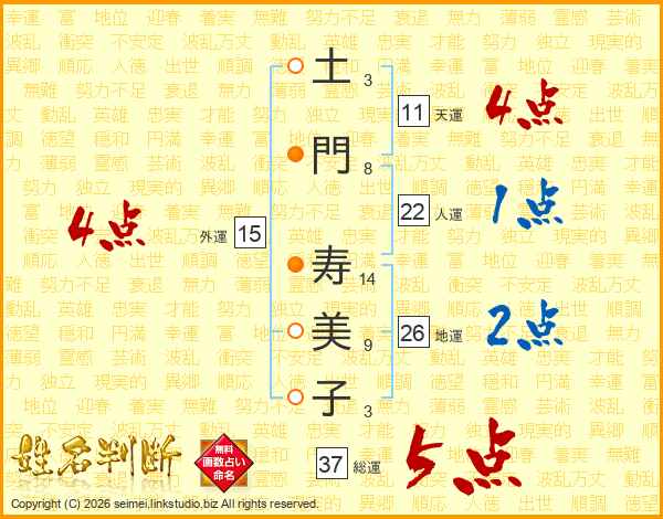 土(3画)門(8画) 寿(14画)美(9画)子(3画)