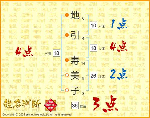 地(6画)引(4画) 寿(14画)美(9画)子(3画)