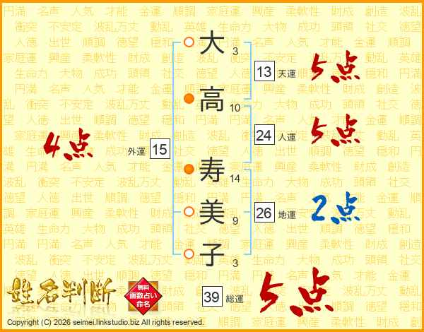 大(3画)高(10画) 寿(14画)美(9画)子(3画)