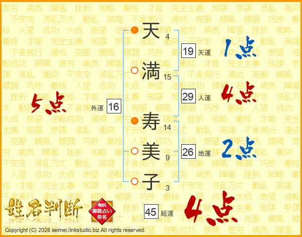天(4画)満(15画) 寿(14画)美(9画)子(3画)