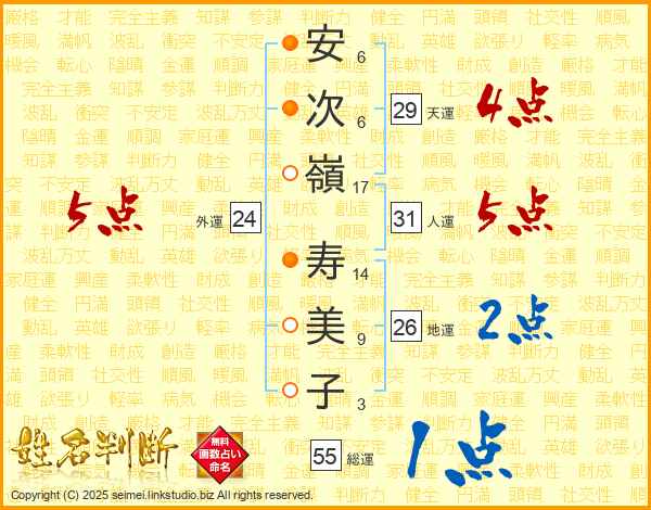 安(6画)次(6画)嶺(17画) 寿(14画)美(9画)子(3画)