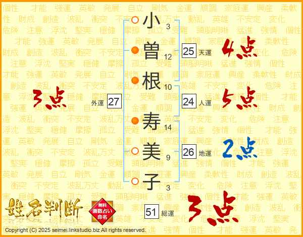 小(3画)曽(12画)根(10画) 寿(14画)美(9画)子(3画)