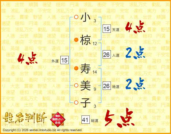 小(3画)椋(12画) 寿(14画)美(9画)子(3画)