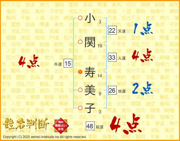 小(3画)関(19画)  寿(14画)美(9画)子(3画)