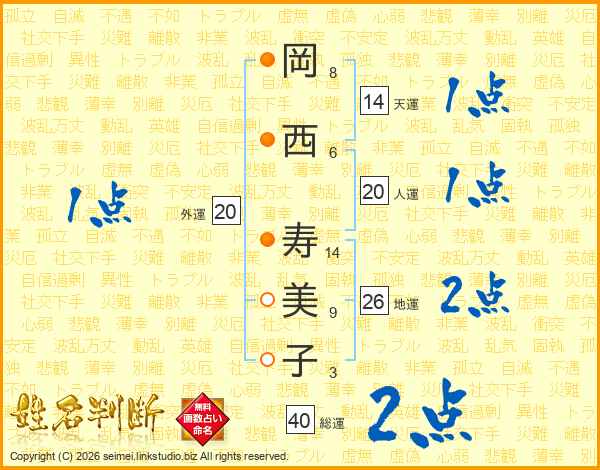 岡(8画)西(6画) 寿(14画)美(9画)子(3画)