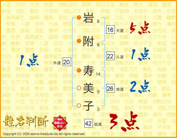 岩(8画)附(8画) 寿(14画)美(9画)子(3画)