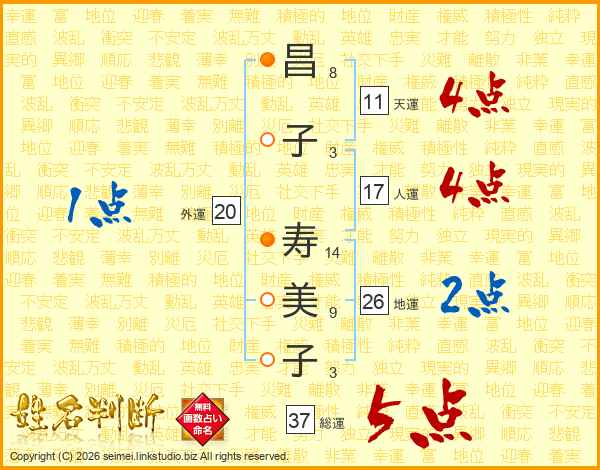 昌(8画)子(3画) 寿(14画)美(9画)子(3画)