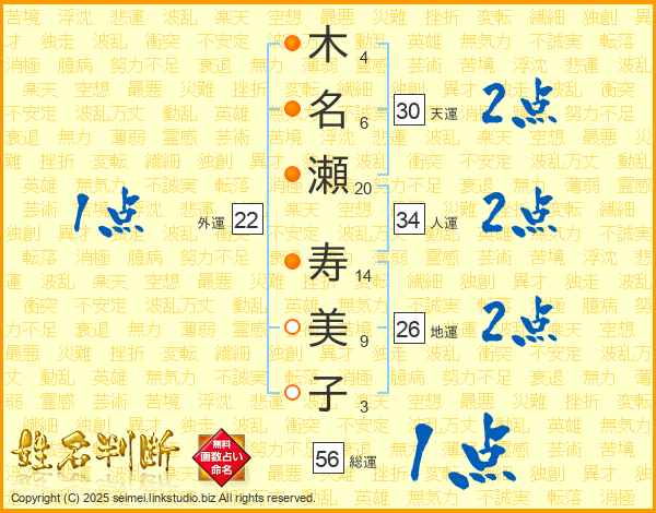 木(4画)名(6画)瀬(20画)  寿(14画)美(9画)子(3画)