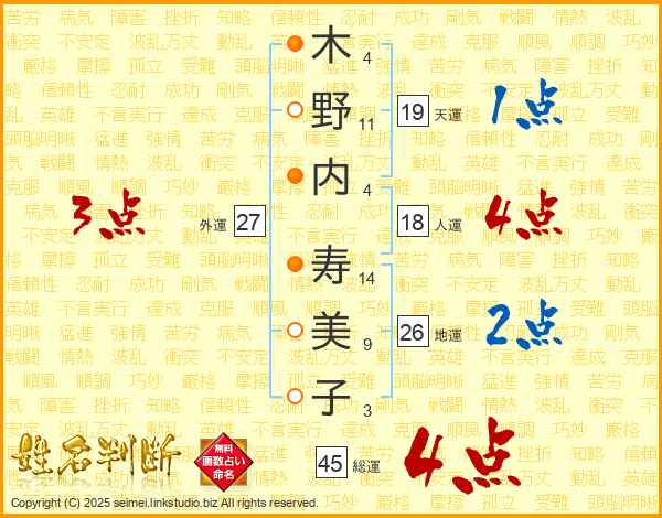 木(4画)野(11画)内(4画) 寿(14画)美(9画)子(3画)