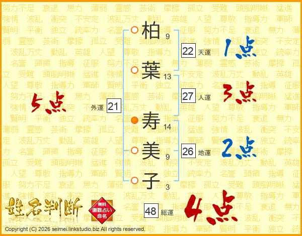 柏(9画)葉(13画) 寿(14画)美(9画)子(3画)