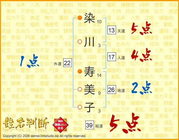 染(10画)川(3画) 寿(14画)美(9画)子(3画)
