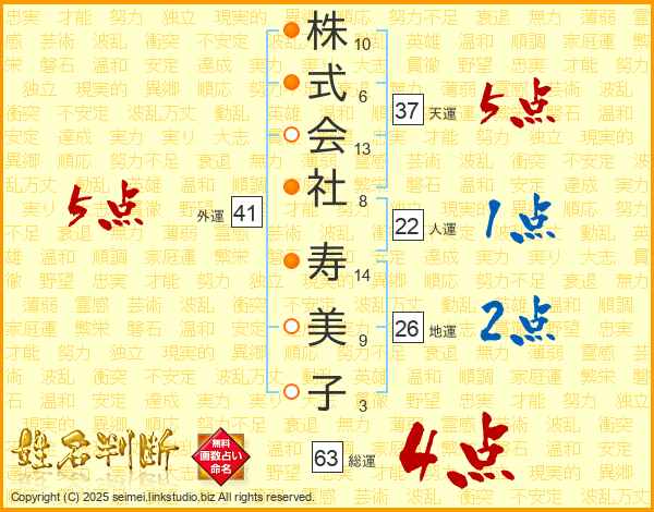 株(10画)式(6画)会(13画)社(8画) 寿(14画)美(9画)子(3画)