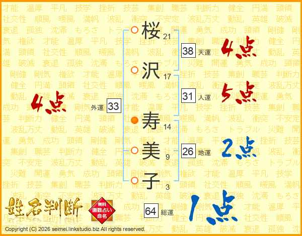 桜(21画)沢(17画) 寿(14画)美(9画)子(3画)