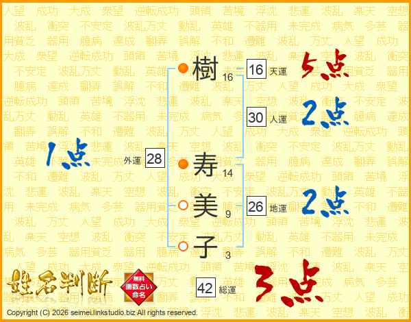樹(16画) 寿(14画)美(9画)子(3画)
