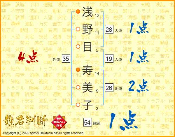 浅(12画)野(11画)目(5画) 寿(14画)美(9画)子(3画)