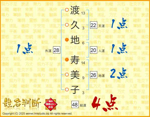 渡(13画)久(3画)地(6画) 寿(14画)美(9画)子(3画)