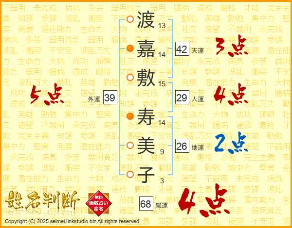 渡(13画)嘉(14画)敷(15画) 寿(14画)美(9画)子(3画)