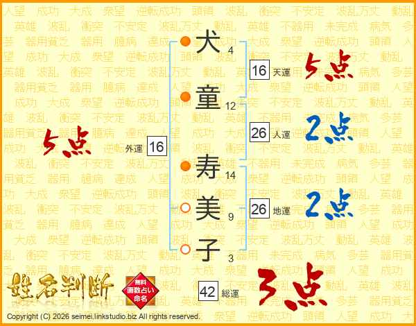 犬(4画)童(12画) 寿(14画)美(9画)子(3画)