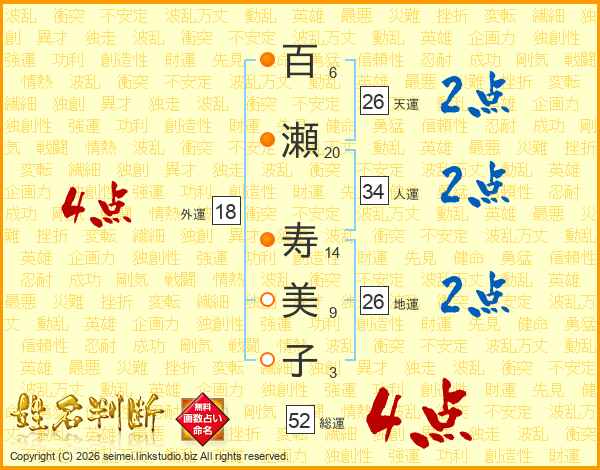 百(6画)瀬(20画) 寿(14画)美(9画)子(3画)