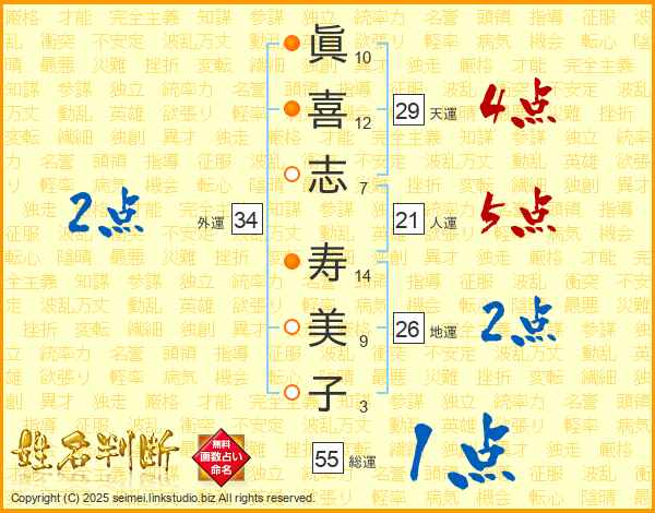 眞(10画)喜(12画)志(7画) 寿(14画)美(9画)子(3画)
