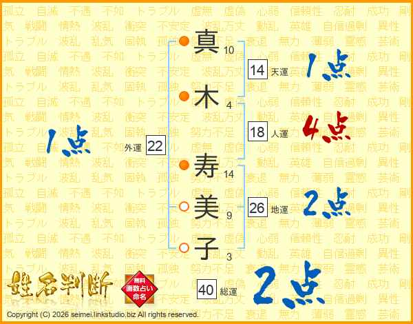 真(10画)木(4画) 寿(14画)美(9画)子(3画)