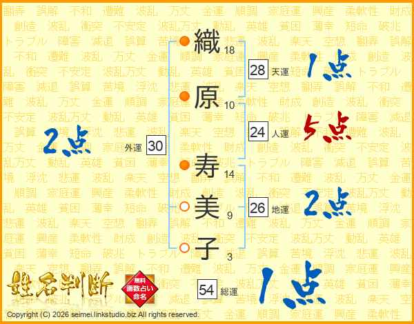 織(18画)原(10画) 寿(14画)美(9画)子(3画)