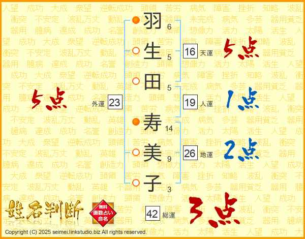 羽(6画)生(5画)田(5画) 寿(14画)美(9画)子(3画)