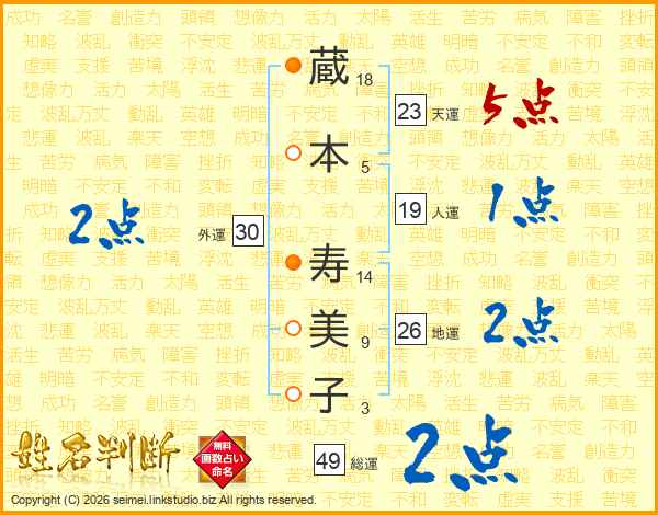 蔵(18画)本(5画) 寿(14画)美(9画)子(3画)