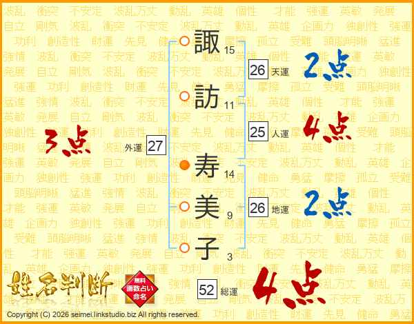諏(15画)訪(11画) 寿(14画)美(9画)子(3画)