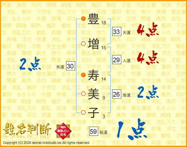 豊(18画)増(15画) 寿(14画)美(9画)子(3画)